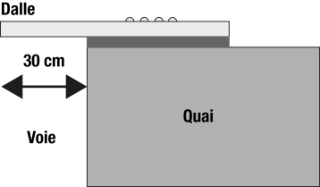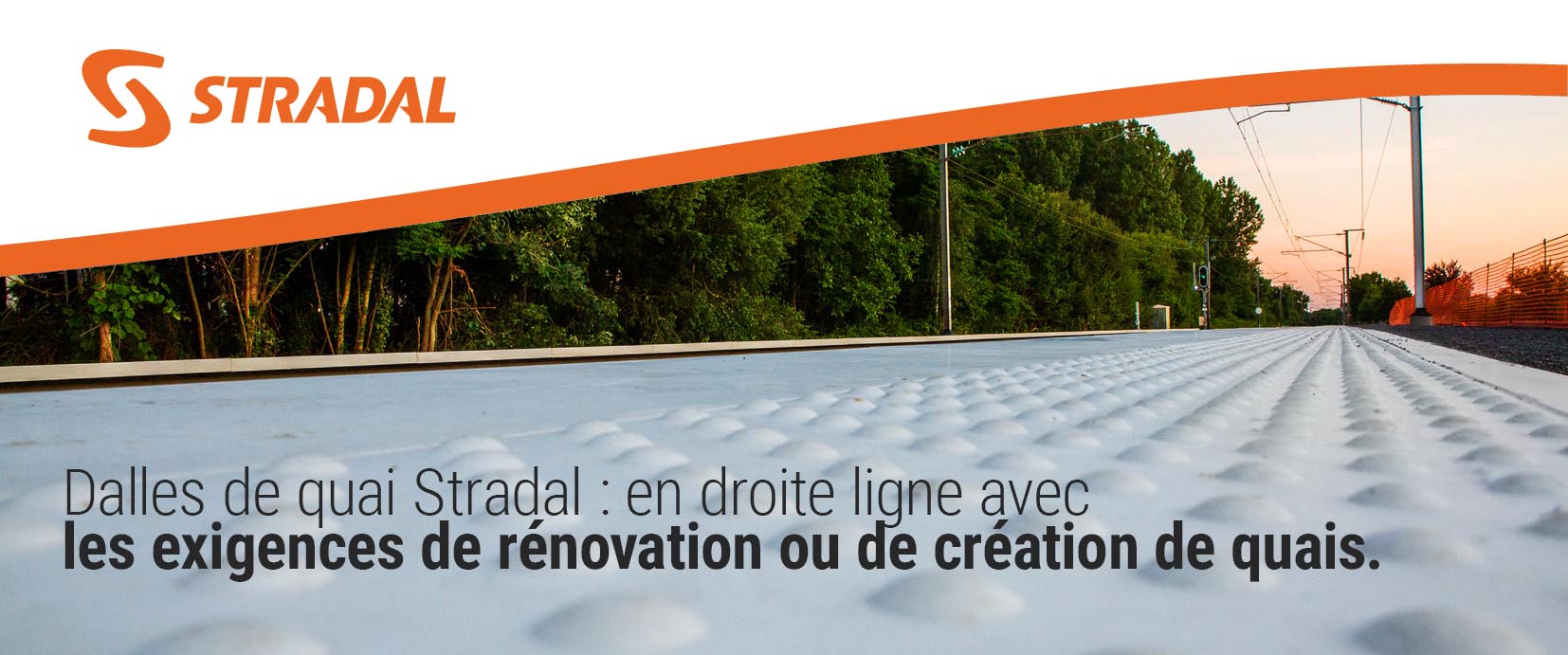 Les DEV Stradal s’adaptent à toutes les configurations de quais grâce à un débord de quai de 30 cm maximum (côté voie) sans déséquilibrage de la dalle. Dotées d’un chanfrein de 5x5 mm côté quai et coté voie, elles facilitent la mise en œuvre et évitent les épaufrures lors du compactage côté quai.