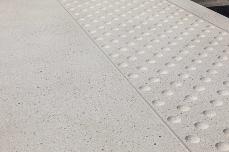 Aspect de surface finition sablée Quartz Blanc, favorisant le contraste visuel des abords de quais de gare.